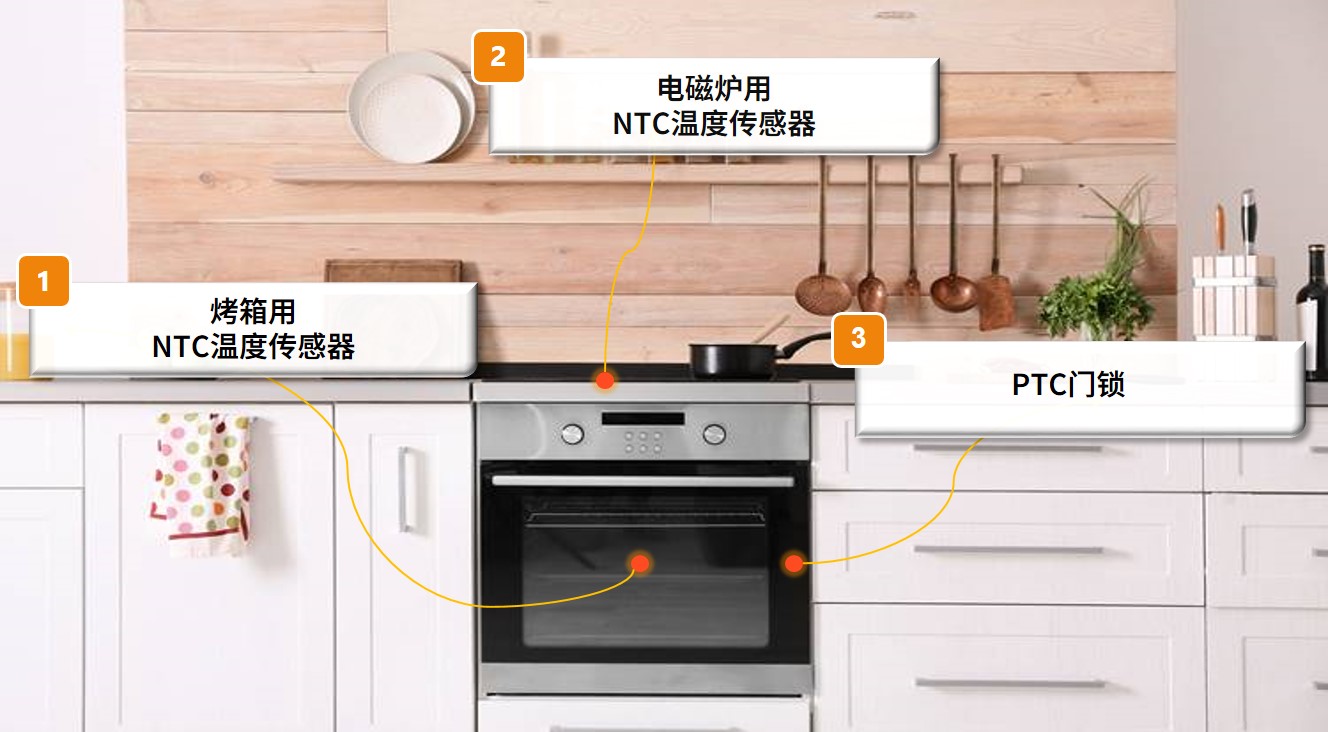 現(xiàn)代電烤箱提供熱對流功能,達成快速均勻的烘烤效果,而多功能烤箱如蒸烤箱、微波烤箱則提供不同烹調(diào)方式和溫度設(shè)定。為了控制加熱,烤箱內(nèi)通常須安裝溫度傳感器,偵測熱空氣溫度。適用于烤箱的NTC溫度傳感器,封裝于不銹鋼外殼并使用耐高溫線材,傳感器(頭部)可測量高達300°C的溫度。